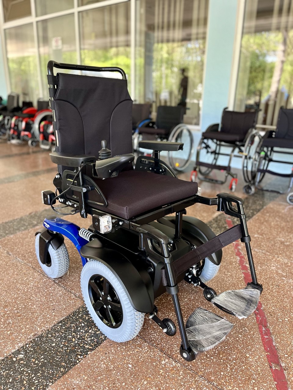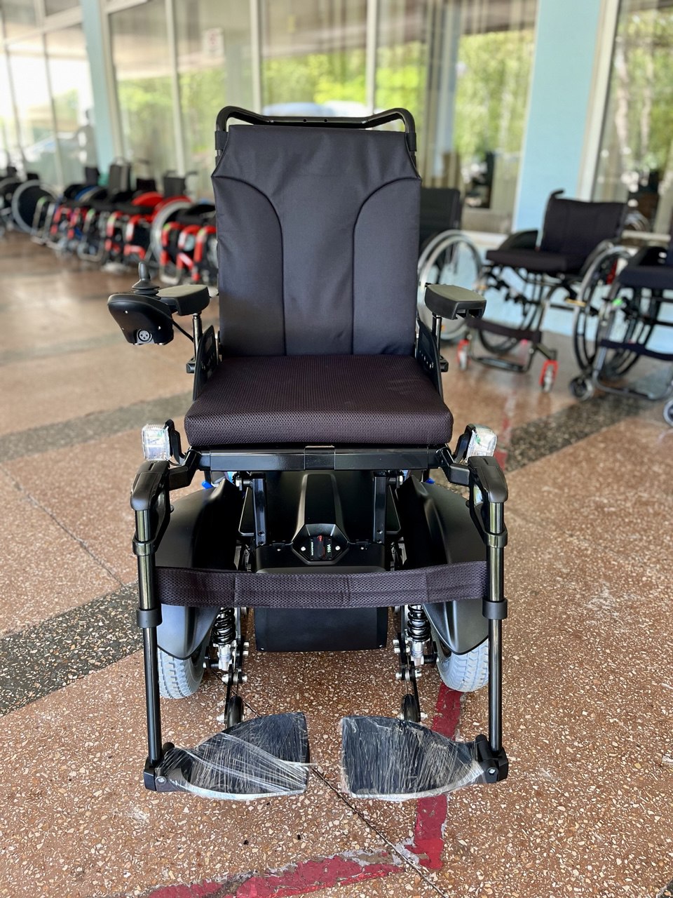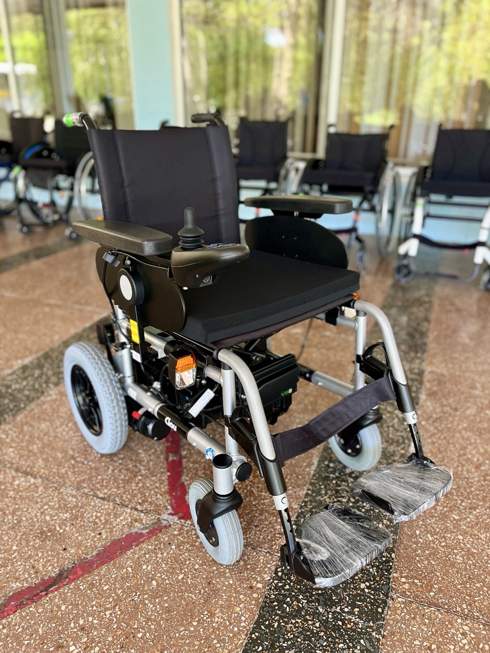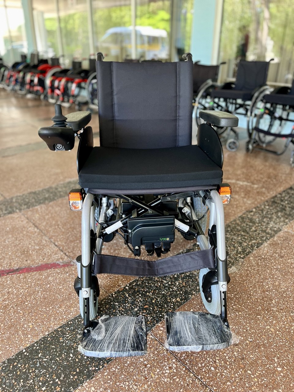 Данная модель оснащена кофром и вместительным багажником под сиденьем, а также двумя крючками на которые при необходимости можно повесить сумку, рюкзак или верхнюю одежду, что делает модель удобной для поездок в магазин. Откидные подлокотники дают возможность человеку с ограниченной подвижностью легко осуществлять посадку и высадку.