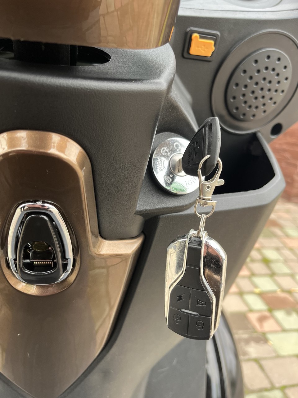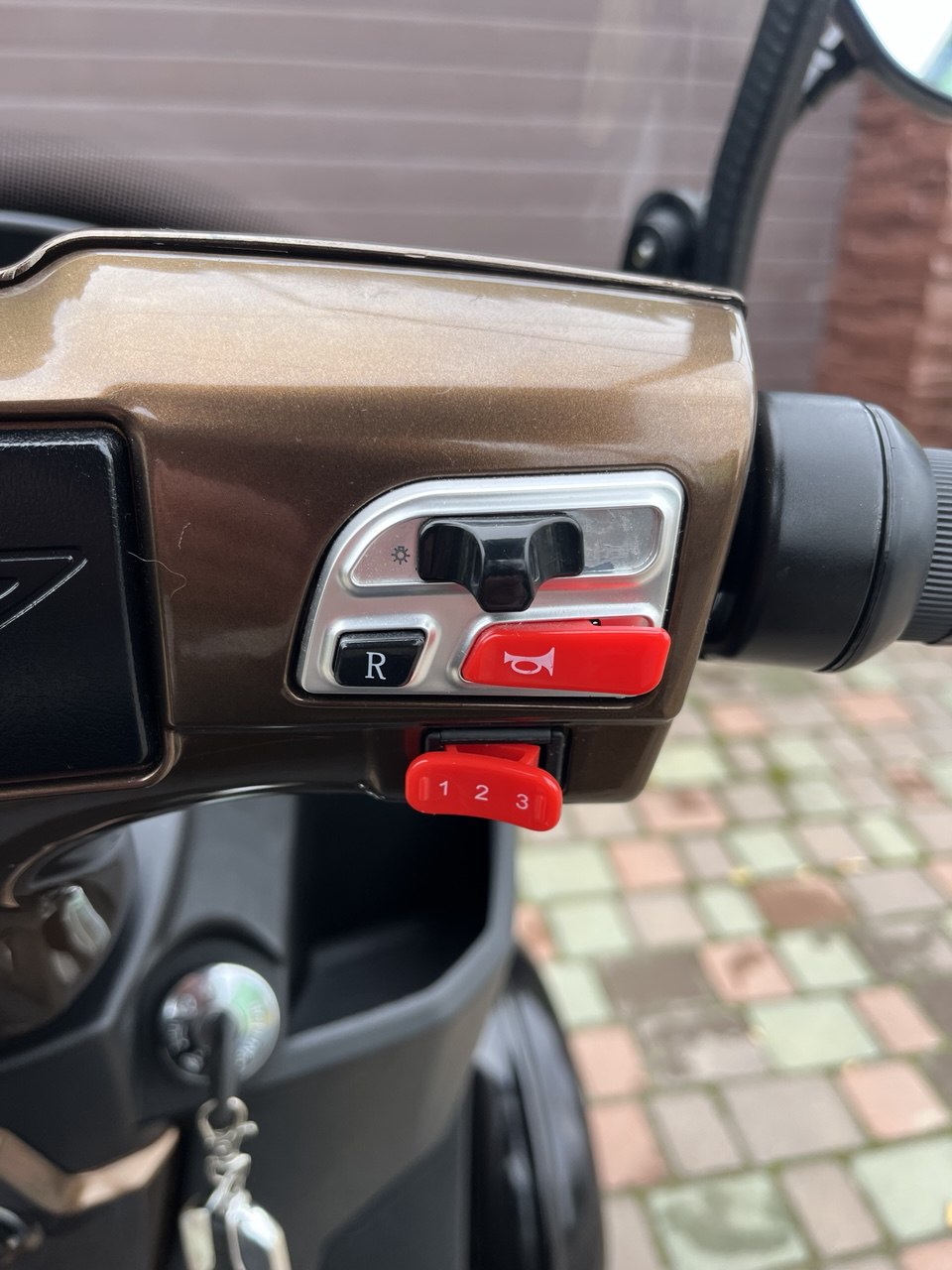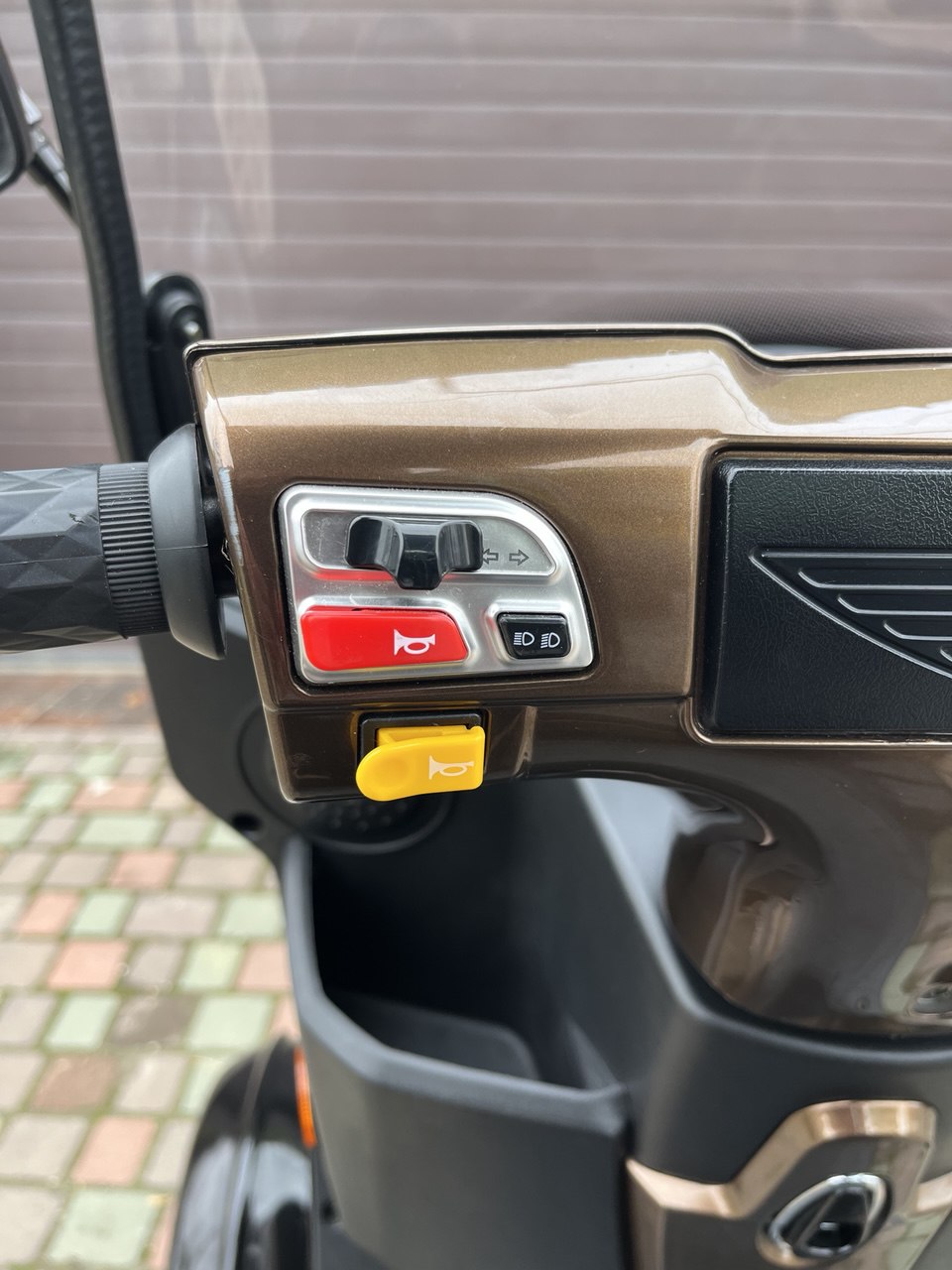 Электроскутер оснащен рулем мотоциклетного типа: для того чтобы начать движение необходимо повернуть на себя ручку газа с правой стороны руля, остановить движение можно с помощью ручного тормоза.